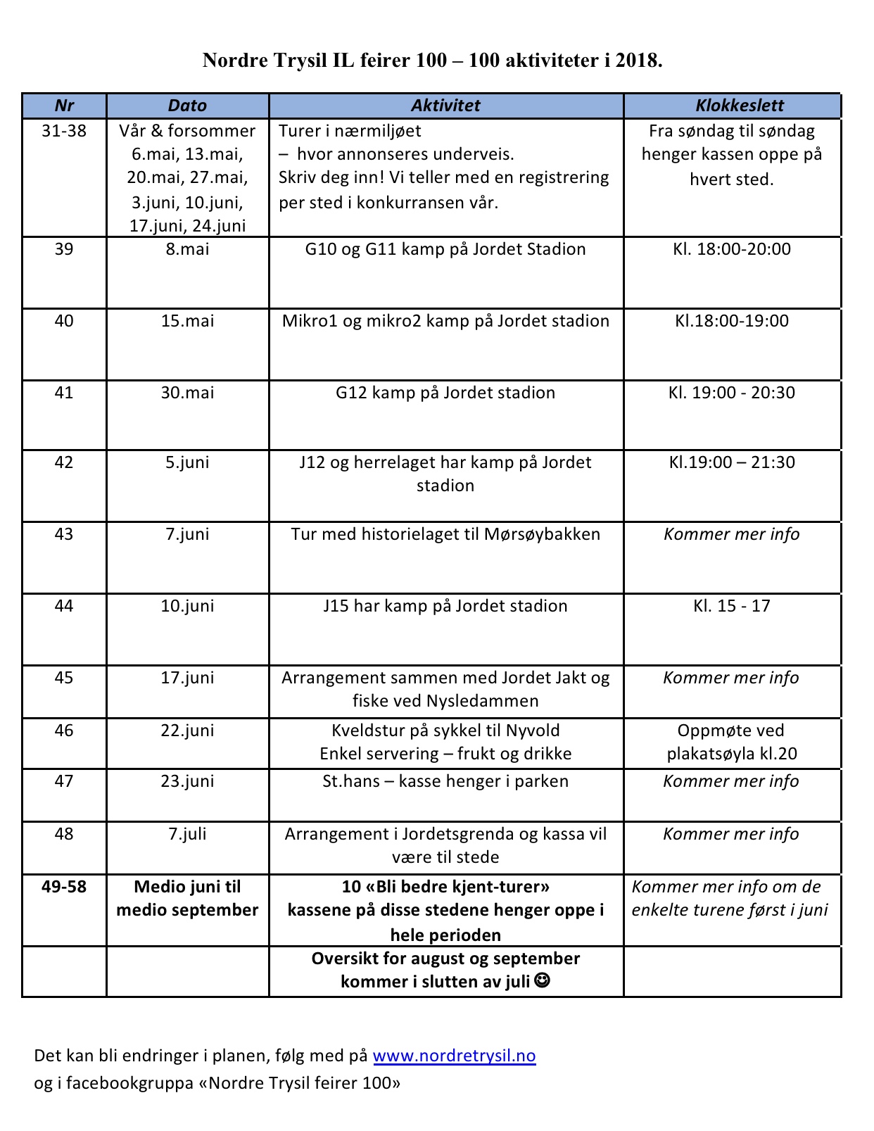 Det blir "Ut på tur-kasser" hver uke ut juni, mange kasser til stede på Jordet stadion, noen andre dag- eller kveldsarrangementer og ikke minst "10 Bli bedre kjent turer" som skal henge oppe fra medio juni til medio september. Noe for alle og en hver. Håper å se navnet ditt i en eller flere av bøkene. ?