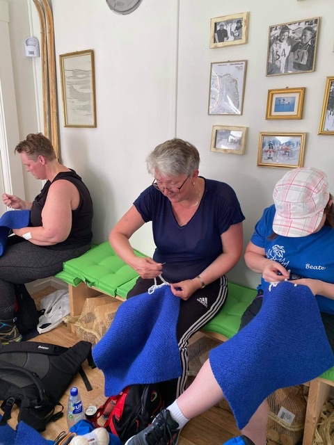 Syklubben «Knute på trå’n» har strikket sitteunderlag til å ha i kvilbua på Omformer’n. Underlagene er på plass der nå og syklubben håper dem kan varme noen rumper i høst og vinter.